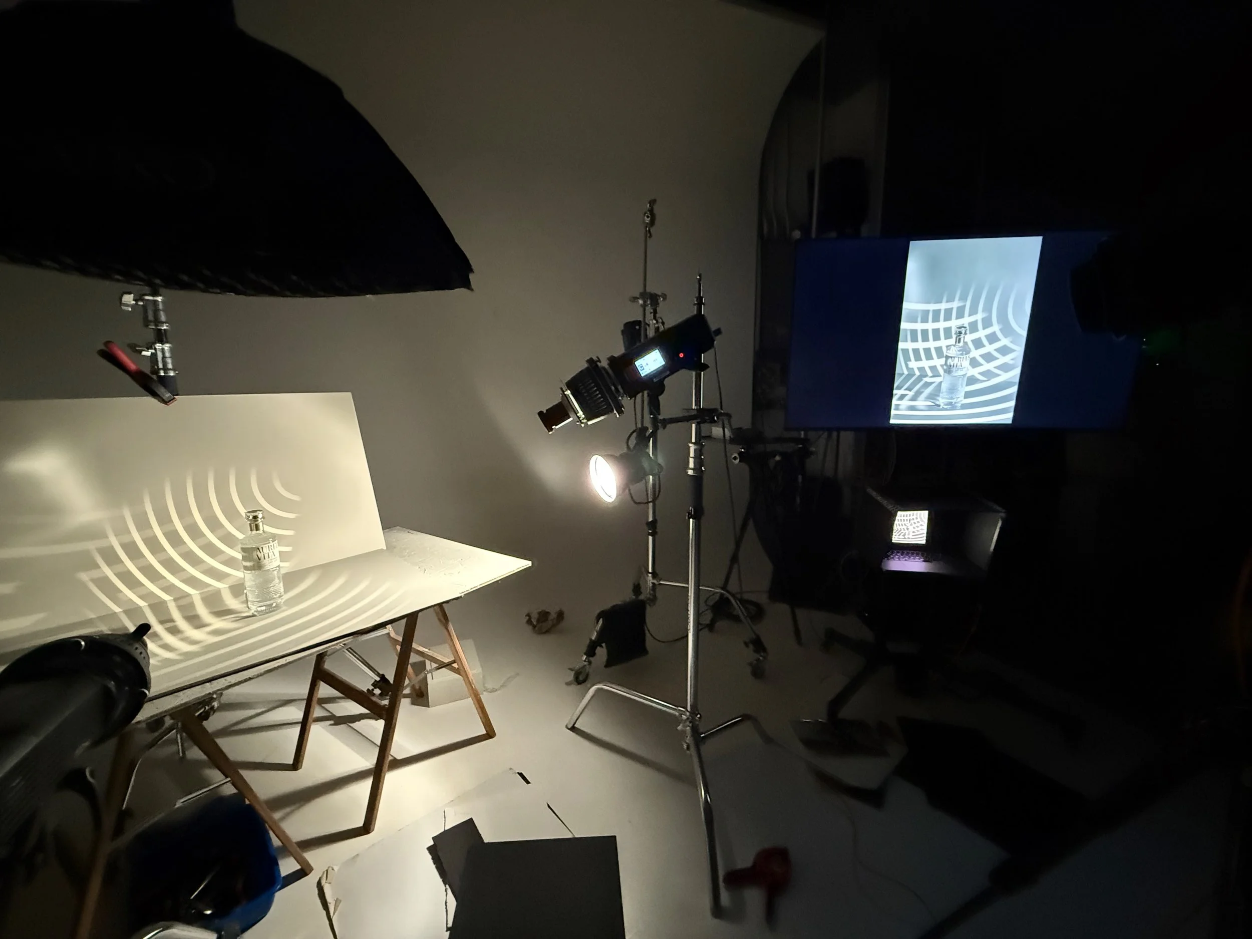 We crafted custom gobos to project the bottle's intricate patterns onto the backdrop, seamlessly integrating the brand's aesthetic into every shot.